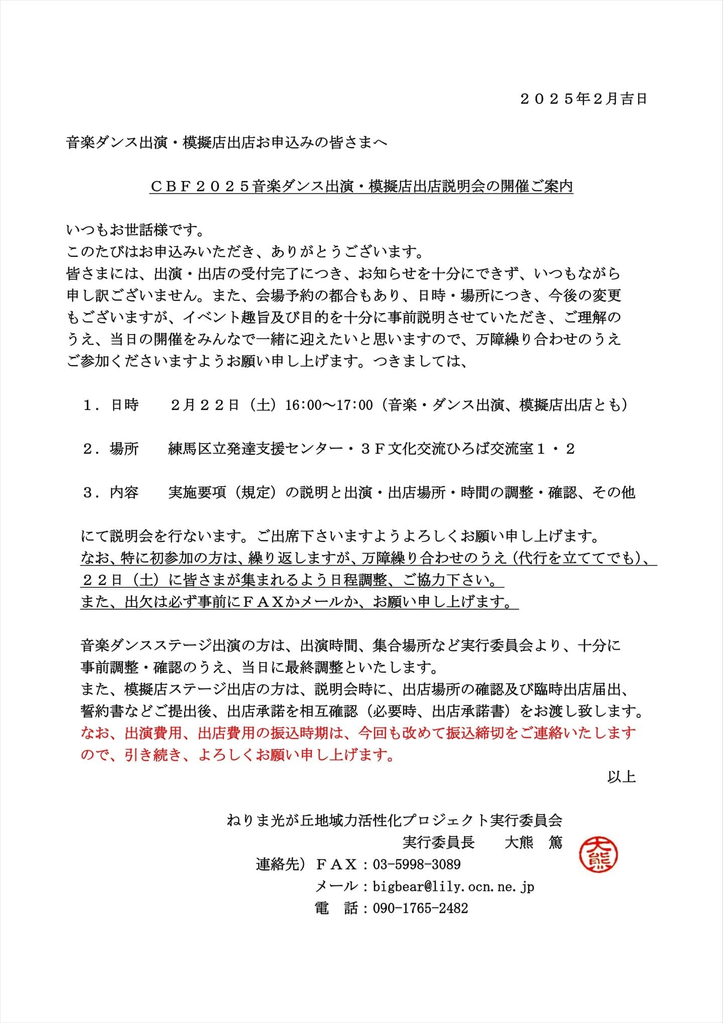 注意事項 | 1)公序良俗に反する音楽・ダンスは禁止とします。 2)各自の荷物は自己管理です。盗難、紛失には十分に注意してください。一切の責任義務を負いませんので。 3)小雨決行です。しかし、地震、大雨・大雪など不測の事態により、中止を余儀なくされた場合については、順延はなく中止とします。 当日、雨天時は、こちらから連絡いたしませんので、当日午前8時〜9時に、会場で確認するか、お電話(03-5998-3089 または 090-1765-2482)にてお問合せください。また、当日途中からの雨天の場合は、原則、イベント続行とします。 4)なお、イベント中止の場合、誠に申し訳ございませんが、一切の施行義務の責任(皆さまの出演にかかる費用、準備金など)を負わないものとします。 |